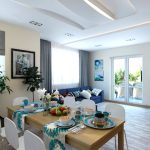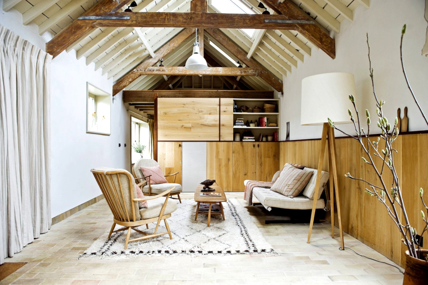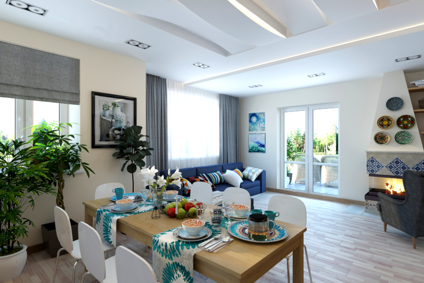 In the spacious living room, you can find space for a small dining table that should not be covered with a tablecloth. You can put a vase of fruit or flowers on it. Clay pots with houseplants will also look organic.