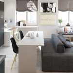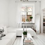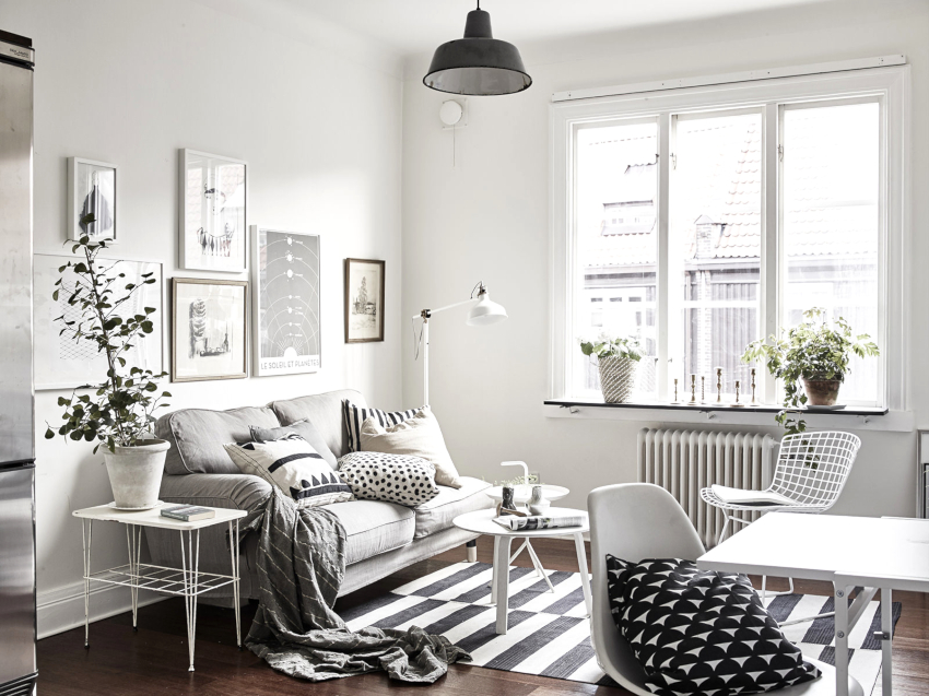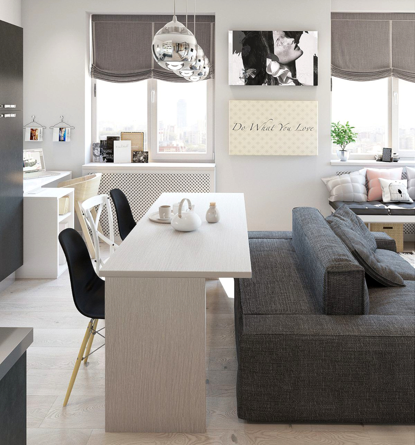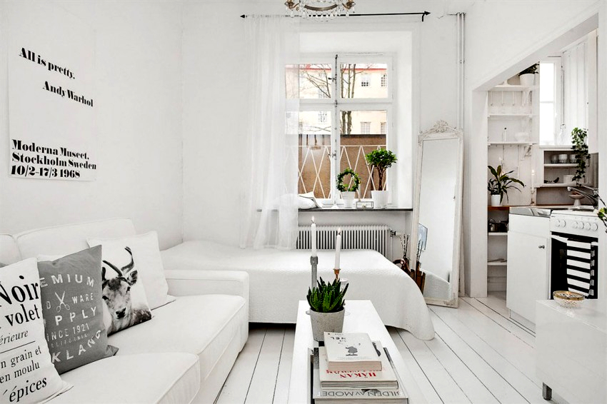 Breathe life into a monochrome room with distinctive decor and textiles. Frames with colored posters can be hung on the walls. Fancy flower pots should be placed on the windowsill in the kitchen area, which will fill the room with natural comfort and coziness. Textiles should overlap in different areas. For this, it is recommended to use the same pillows, curtains, rugs. The general concept also includes towels, potholders and chair covers.