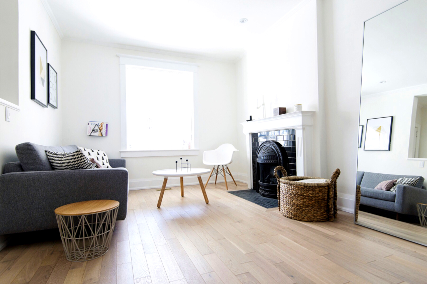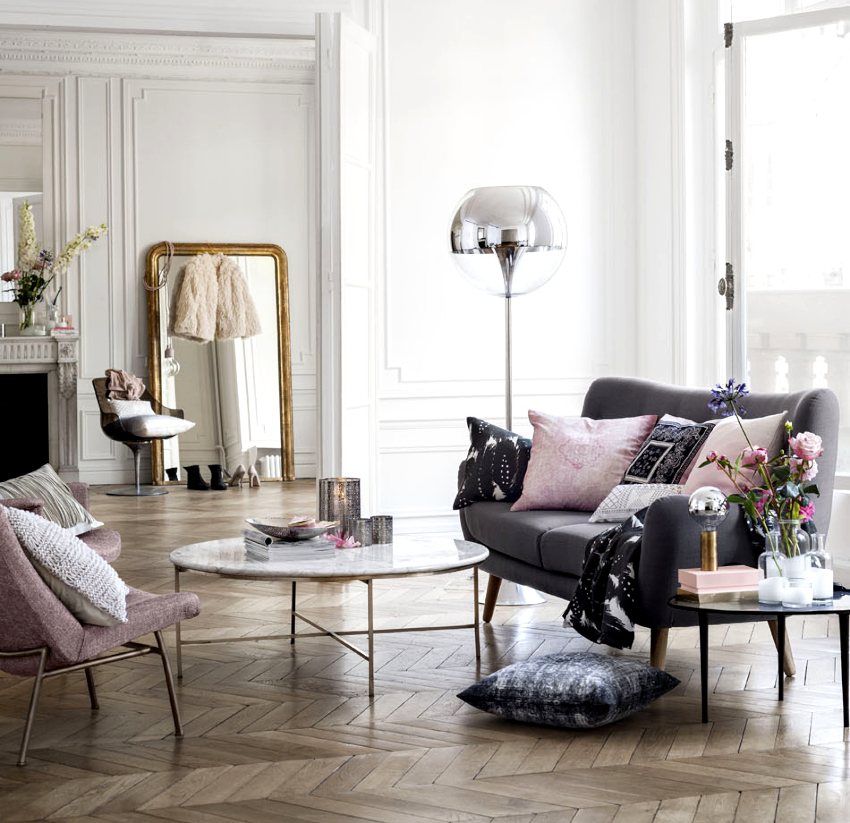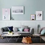 The walls are usually painted white. You can give surfaces a light shade of blue or pink. A good solution would be gray wallpaper in the living room interior, which contrasts with the white canvas and light floor. Such a minimalistic backdrop is an ideal win-win solution for placing natural furniture and accessories. The surface can be supplemented with various stenciled inscriptions. They can be arranged symmetrically or scattered randomly over the entire area, as shown in the photo of beautiful living room interiors.