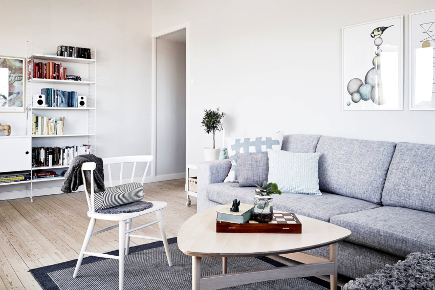For a living room in a Scandinavian style, it is unusual for a pile of furniture. Each element performs its direct function and should be as practical and functional as possible. The sufficient minimum includes items such as a sofa, a couple of armchairs, a table with chairs and a compact, roomy wardrobe with open shelves.