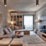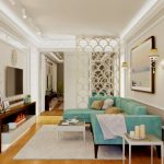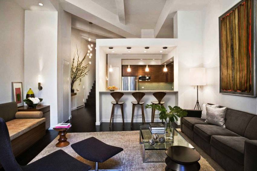 Convertible furnishings are ideal for creating a characteristic ambience in a modern living room. These can be folding sofas that, when folded, turn into wardrobes, armchairs, dining sets with folding tables and a certain number of folding chairs or stools. Different options for such furniture are shown in the photo of the design of a modern living room.