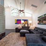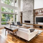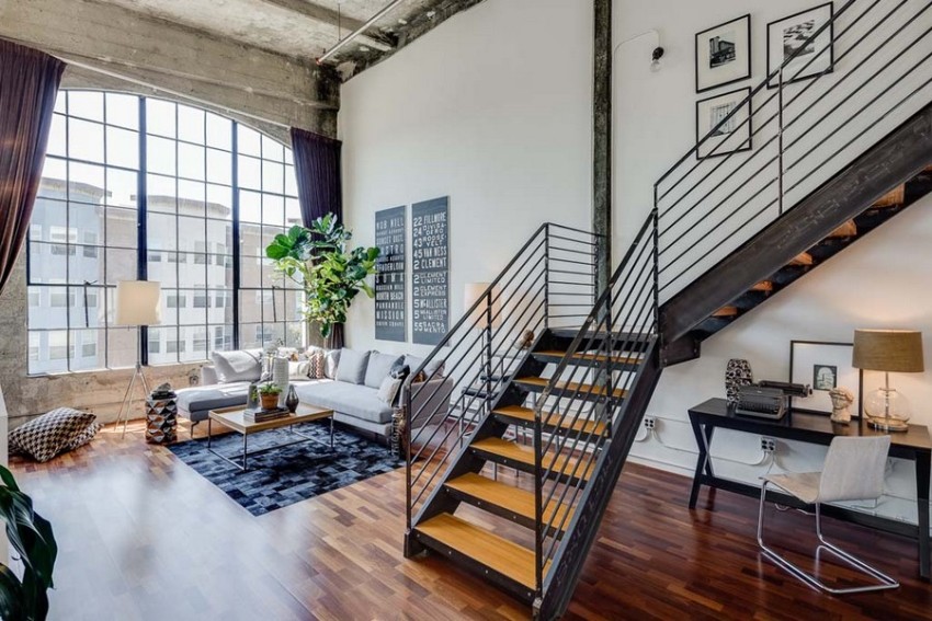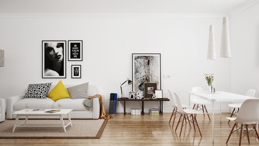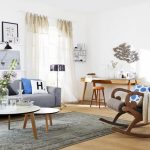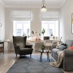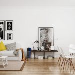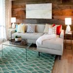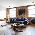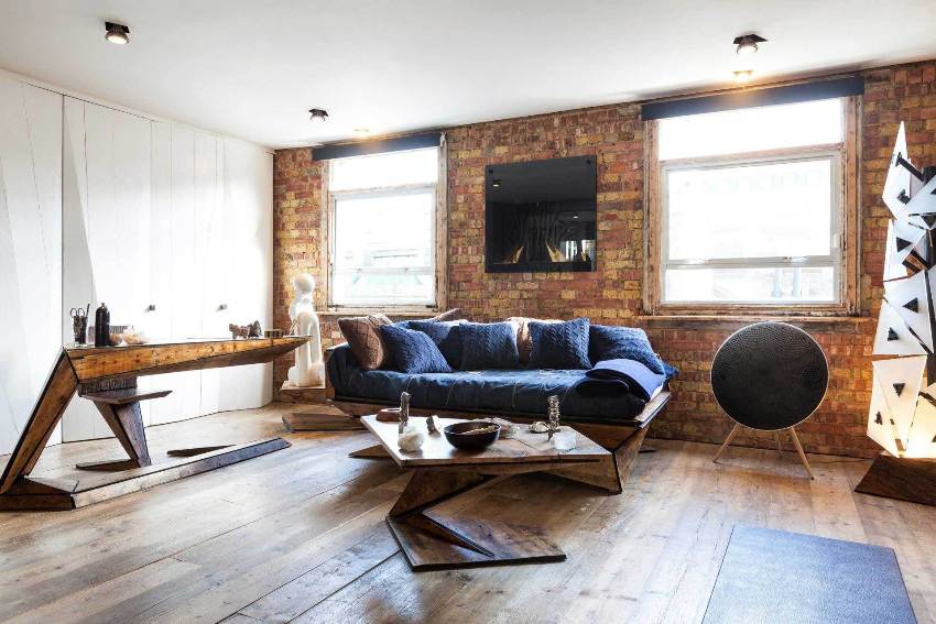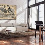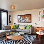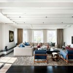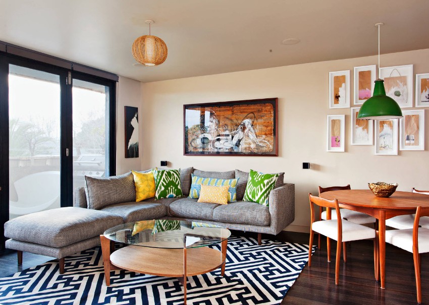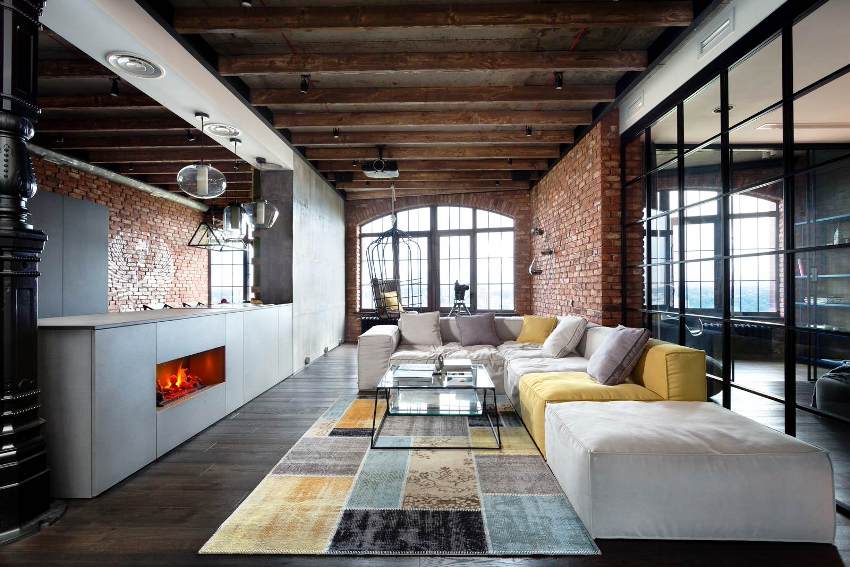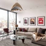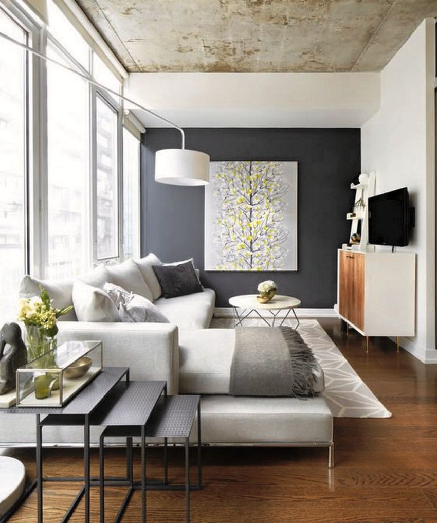 One of the most popular options for flooring in modern living room interior design is laminate, which is practical, attractive appearance and low cost. The material has a variety of designs. The coating with imitation of natural wood, made in natural shades, looks colorful. Multicolored boards attract with their originality. An interesting option is models with a decorative print. The industrial feature of modern style will be favorably emphasized by a laminate imitating marble.