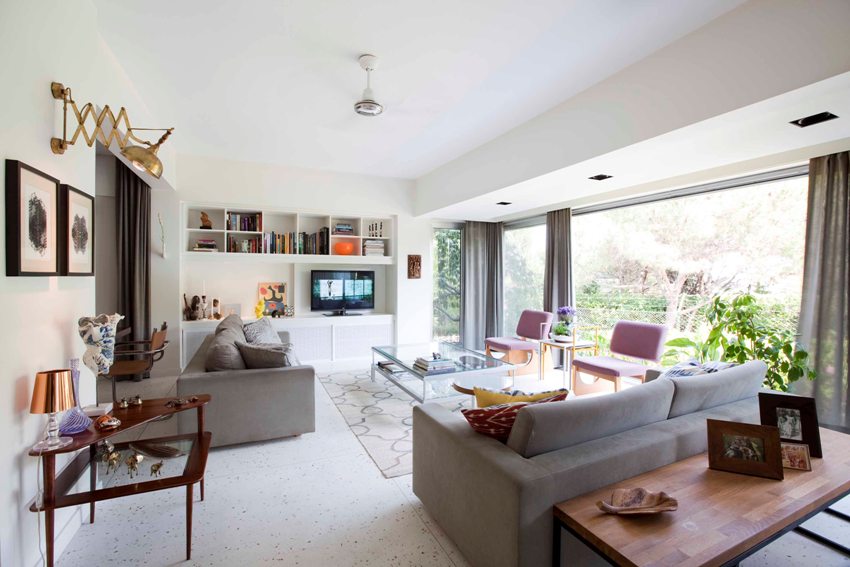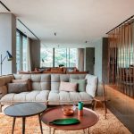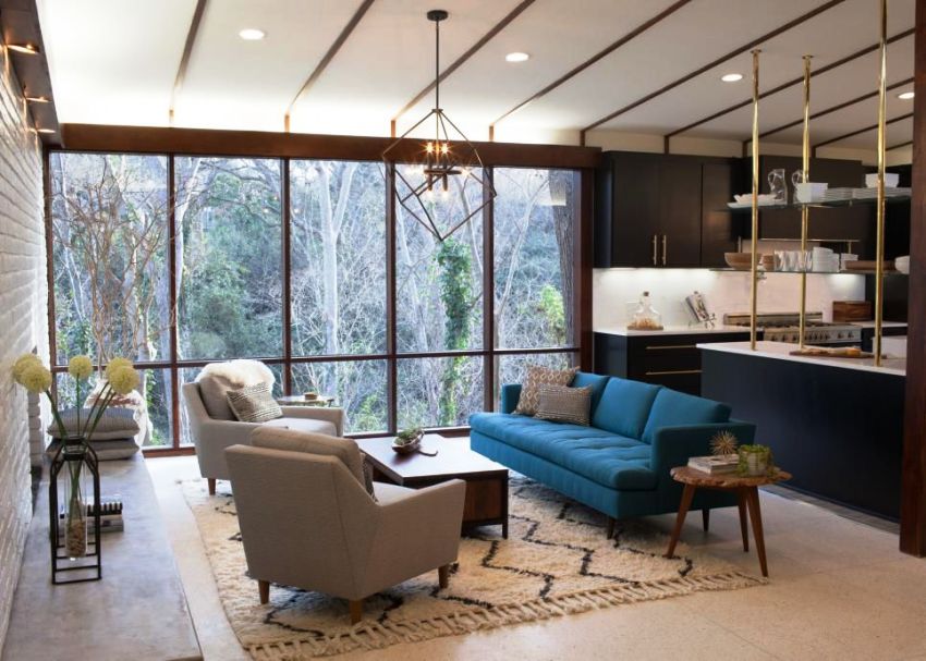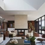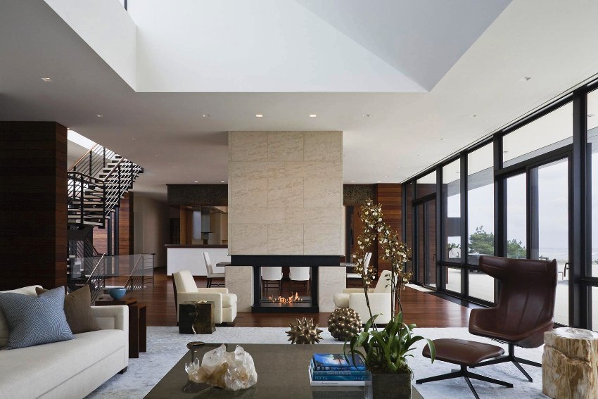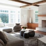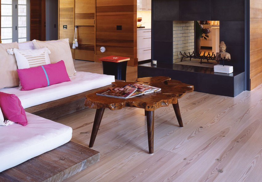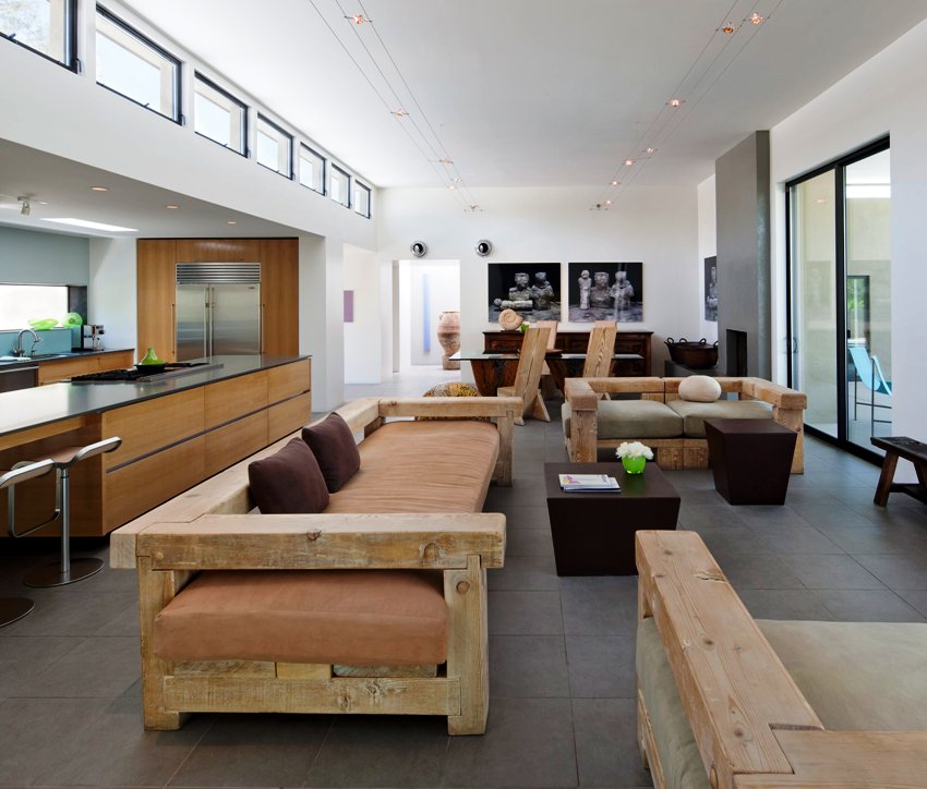 The use of beamed ceilings in a modern living room brings a touch of rural life to a progressive interior