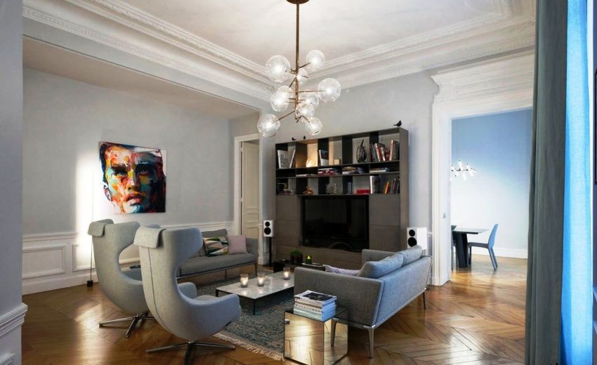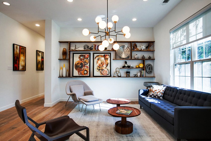 A modern stylish living room should be filled with light, which cannot be much. For this, various lighting fixtures are used, ranging from traditional ceiling chandeliers and wall sconces to ultra-modern LED spotlights.