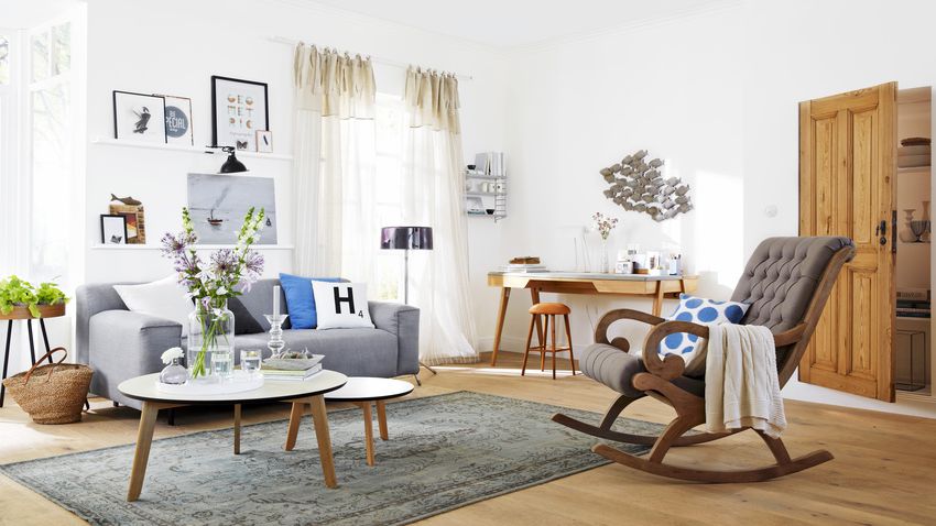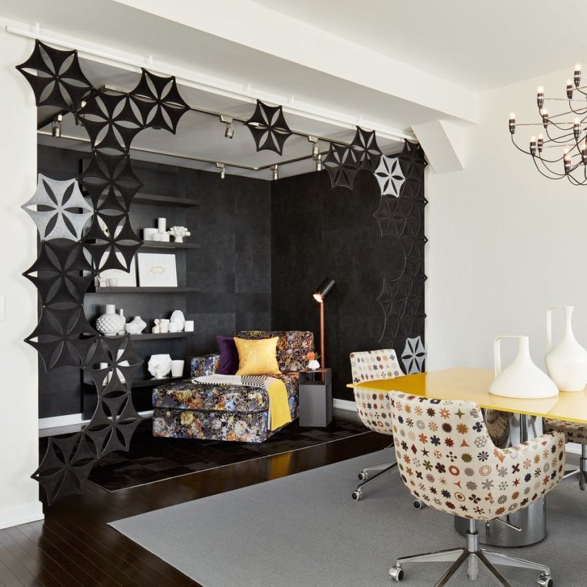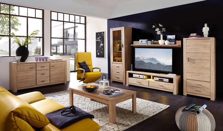 In the interior of a modern living room, individual surfaces are often distinguished using texture or print.