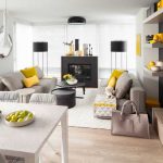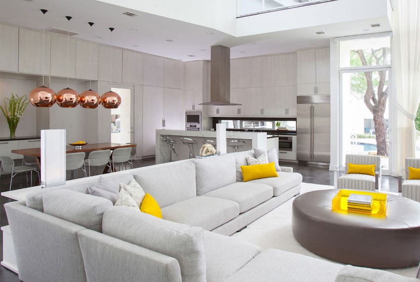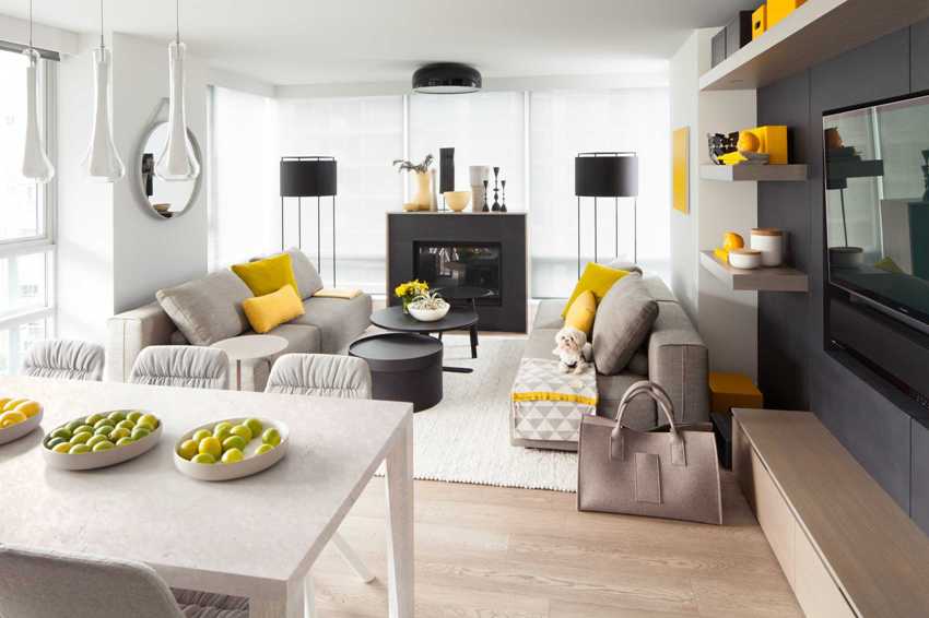 The living room in a modern style, decorated in beige and cream color, will look organic. Such a warm room will help you relax after a hard day, and will emphasize the sincere atmosphere of your home. For a large room, you can use a yellow-brown palette, which will fill the overall atmosphere with sunlight and cheerfulness, which is clearly displayed by photos of the interiors of the kitchen-living room in a modern style. However, you should not use bright colors here, which will look defiant. It is better to opt for pale pastel and mustard shades.