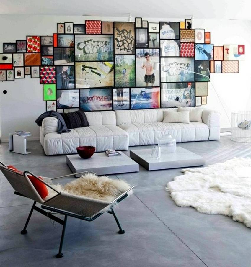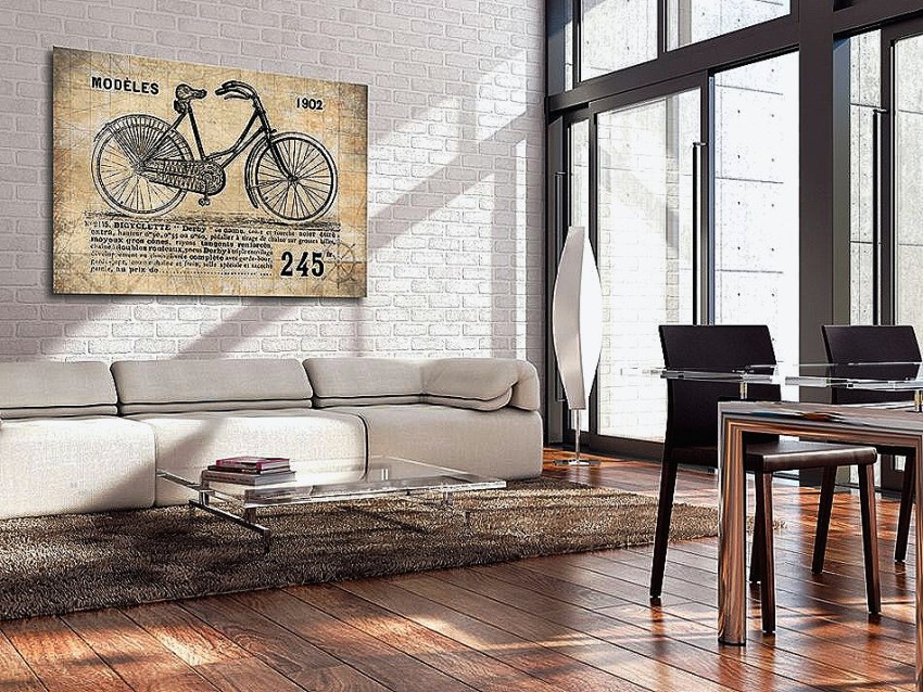 Abstract paintings in the interior of the living room in a modern style in massive frames will look unique on plain walls. Watercolor painting or black and white graphics may be a good option.