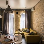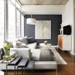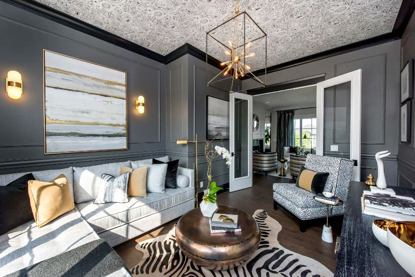 The living room in dark color will look modern, interesting and bold. Khaki color, shades of burgundy, blue and plum, complemented by pure black details, look organic. This palette is skillfully combined with metallic colors and warm gray tones.