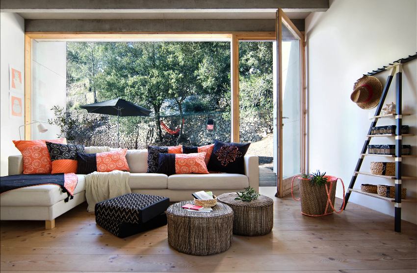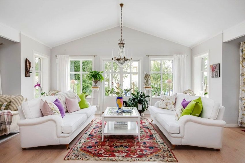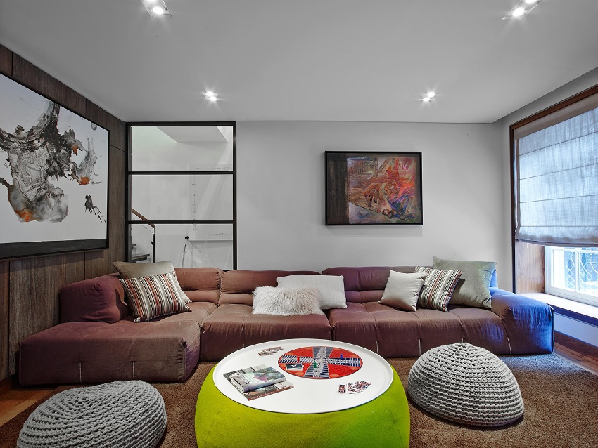 Bright sofa cushions not only diversify the color palette of the interior, but also help to comfortably sit in the recreation area