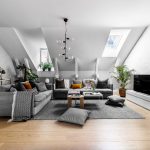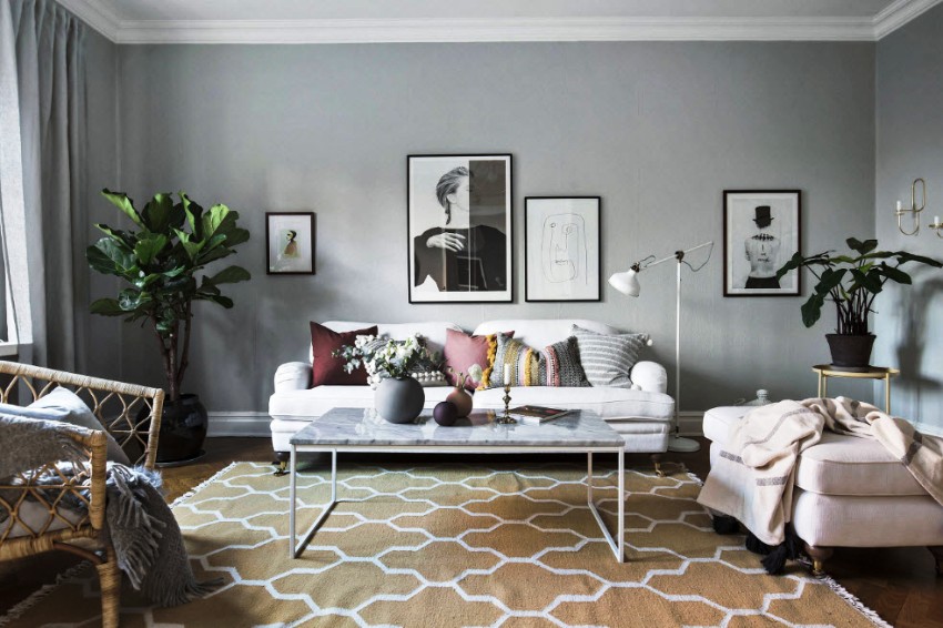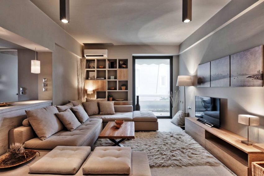 In modern design projects, you can often find a neutral palette in the design of the floor of living rooms.
