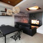 If a stretch ceiling is mounted, numerous small spotlights will look organic. When organizing a two-level drywall structure, LED strips can be used. The same lighting is relevant for lighting a fireplace in a modern living room interior. For local lighting of functional areas, wall or table sconces with a metal body should be used. In this case, it would be appropriate to use matte lamps of traditional cylindrical or round shape.