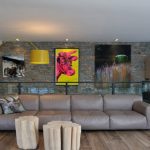 Painted monochromatic walls are a good background for finishing one of the surfaces or parts of it with flexible natural stone, which is reflected in high-tech living room interiors. This cladding also works well with decorative plaster. The soft accent wall behind the sofa looks airy and completely.