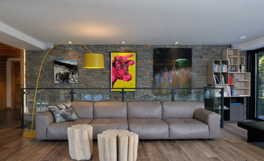 In the interior of the living room in a modern style, there are no restrictions on the use of this or that type of decor