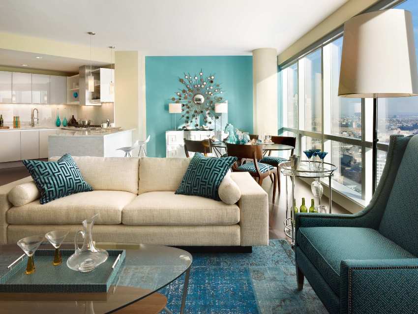 A calm, pacifying atmosphere will help to create the decoration of the room in green, as shown in the photo of the modern living room. Both warm and cold colors look organic here. In the first case, it is desirable to supplement the design with beige and terracotta shades. A cool green tone will go well with lemon and peach colors. A distinctive and interesting design can be achieved by using a light turquoise shade.