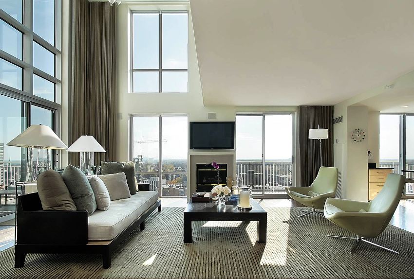 The ceiling of the living room in a modern style is represented mainly by a perfectly flat snow-white surface, devoid of decor. It can be whitewashed or dyed. Stretch ceilings with an organized built-in lighting system are popular. To visually increase the space, it is necessary to use glossy surfaces with a reflective effect.