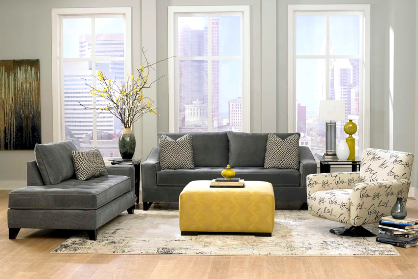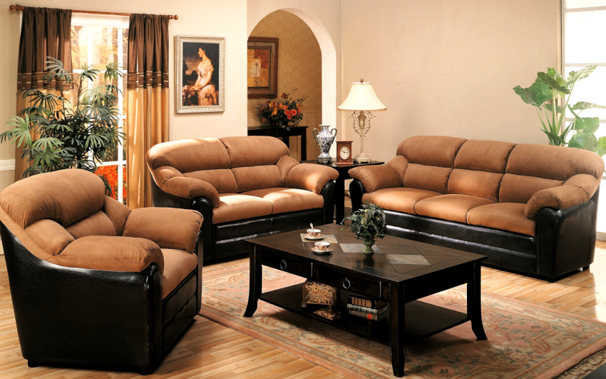 Furniture should be placed against one of the long walls. For a small living room, you should choose soft models with high backs, which will make the room more expressive. In a living room of a non-standard shape, angular or semicircular furniture, in which the walls have beveled edges, will look appropriate.