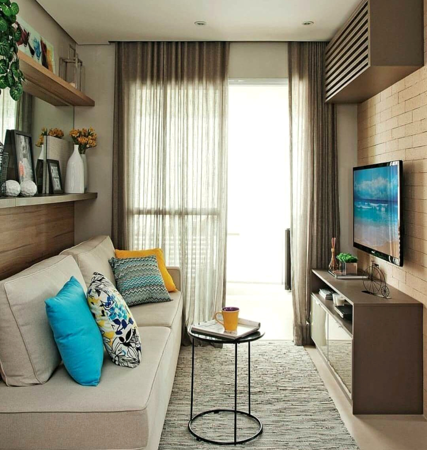 In a square living room, furniture can be located in the center or near the wall. You can create a diamond-shaped environment using corner structures. In a narrow rectangular small living room, the entrance door is opposite the window, which gives it the appearance of a corridor. Narrow racks with elongated open shelves, which are located at one of the narrow walls, will look harmonious in such a room.