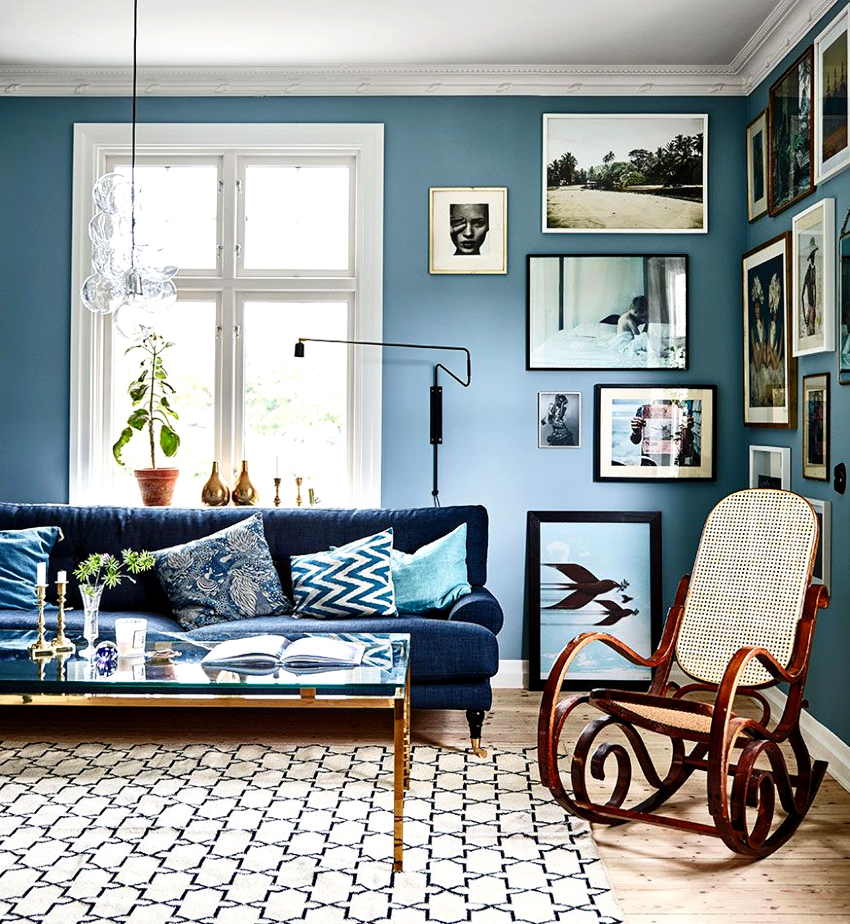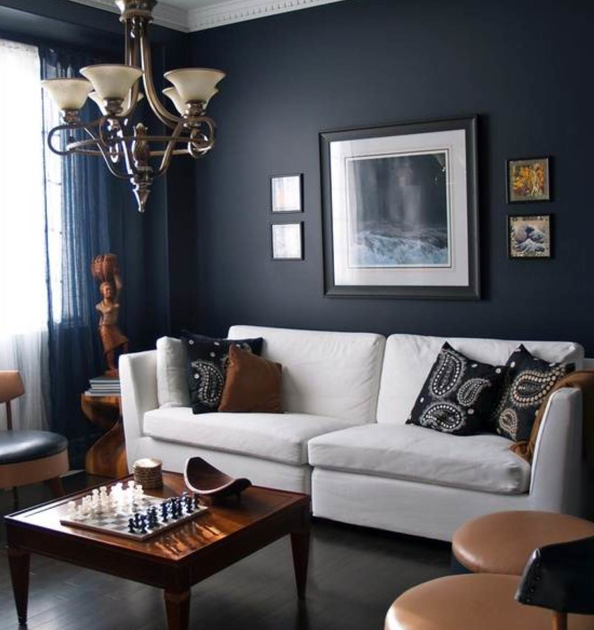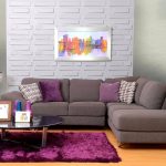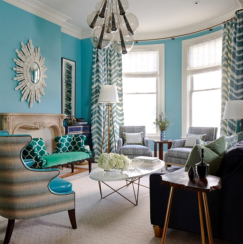 The blue and white living room will look colorful and cool. The ceiling and floor are in light colors and the walls are in blue. Furniture should be white with blue upholstery. The yellow-purple living room looks interesting and harmonious, which creates a romantic mood.
