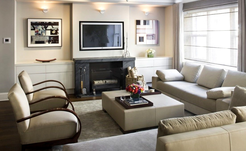 Useful advice! In a small living room, the principle of diagonals works well, which is used to place the sofa and TV at an angle of 45 degrees to the wall.