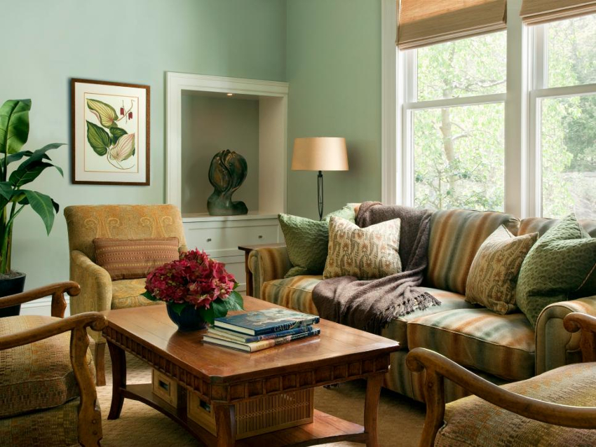 It will be possible to breathe liveliness and naturalness into the room when using green tones in the decoration of the room, which is complemented by elements of natural shades. A varied color palette is shown in the photo of the interior design of a small living room.