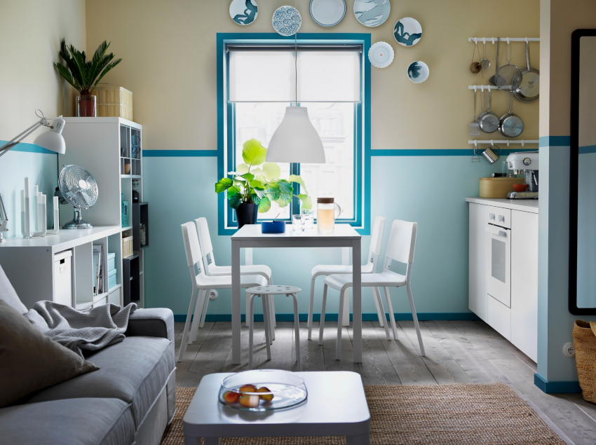 The minimalist living room is designed as simply as possible, no frills, which is visible in a monochromatic neutral finish using white, gray, blue, beige and silver tones, compact furniture and modern technology, as shown in the photo of a small kitchen-living room.