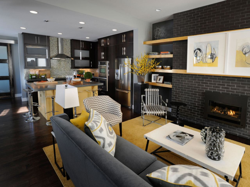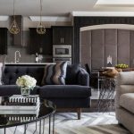 The zoning of the room can be organized with the help of multi-level lighting, various wall and floor designs.Here, not only different materials can be used, but also the same type of finish, differing in shades and texture, as shown in the photo of the design of a small kitchen-living room. Generality of design can be achieved by overflowing tones of the same color or patterns.