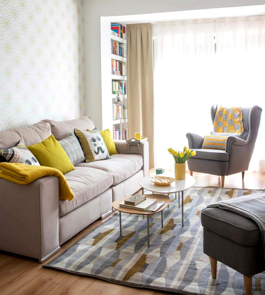 Decorative bright pillows for the sofa will attract attention and bring harmony to the interior. A small carpet will fill the room with warmth and comfort. For a small living room, it is better to give preference to simple monochromatic models with a rectangular shape, which will harmonize the space, giving it the correct shape.