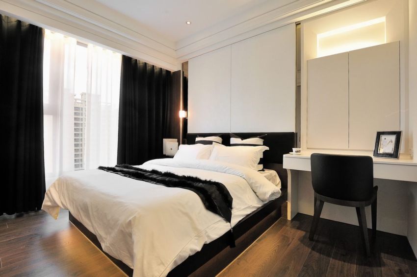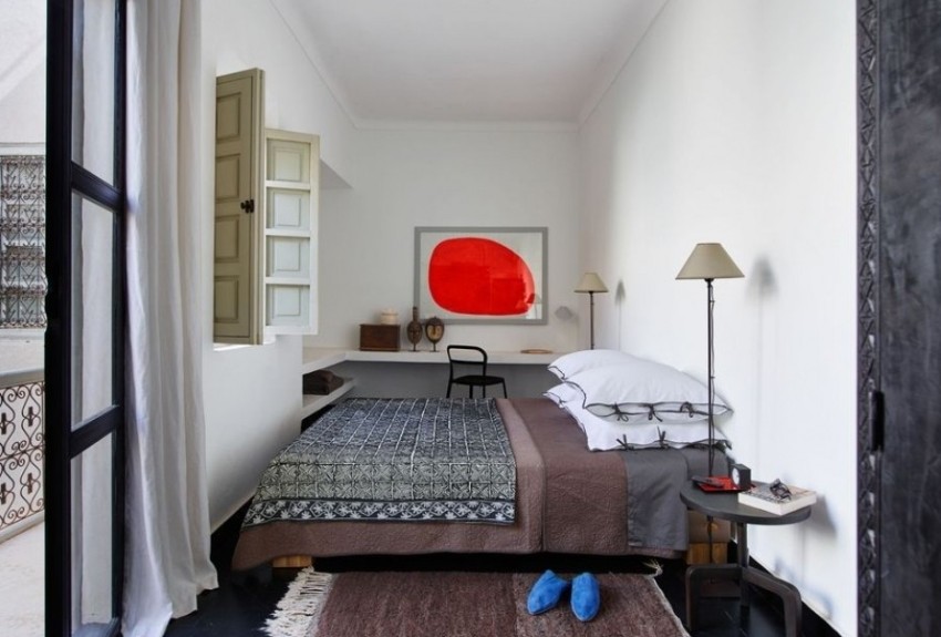If there is no preference, bed it is better to choose an average height (50-60 cm) and width (160-170 cm). Bedside tables can be replaced with wall shelves. It is better to fix them at the head of the bed at the level of an outstretched arm (in the prone position) in order to freely take and lay objects. For work, it is best to use a small console with a portable desk lamp or light fixture, and complement it with a lightweight, retractable chair. It should not obstruct the passage when not in use.