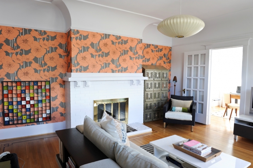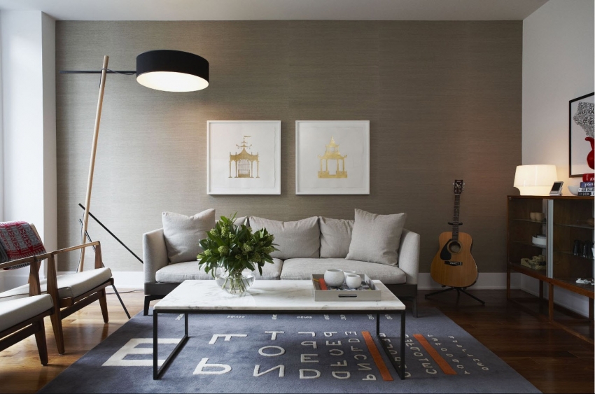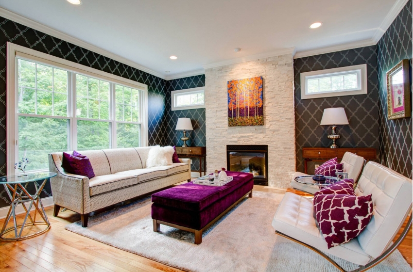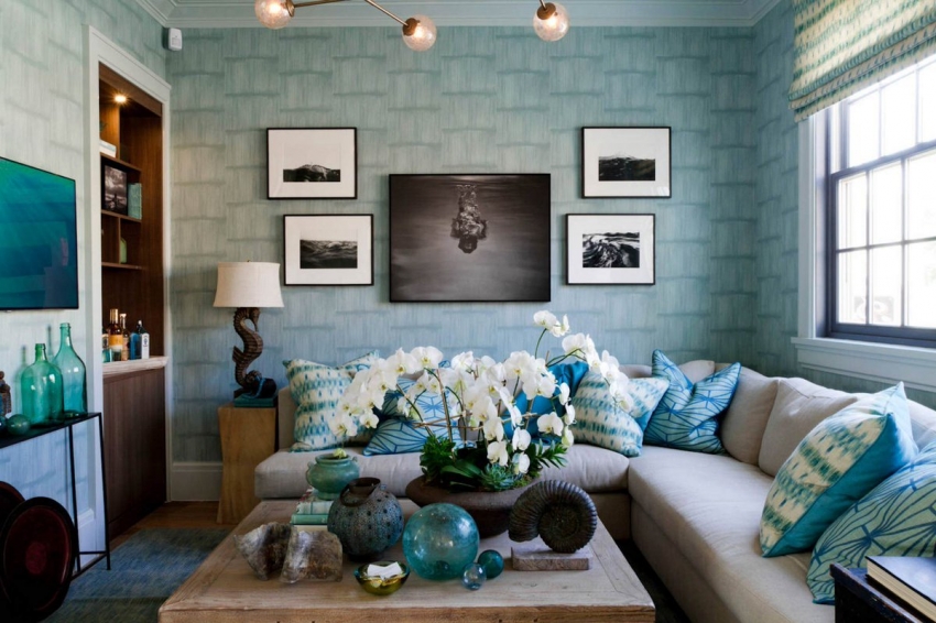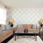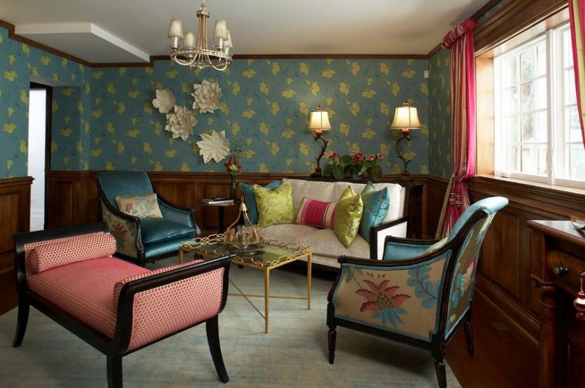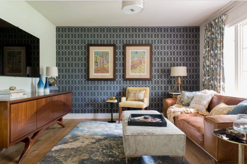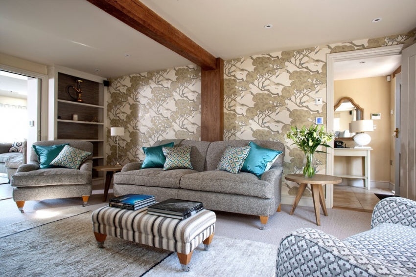 With the help of wallpaper, you can visually highlight and focus on a certain area of the living room