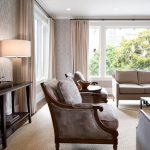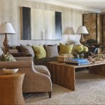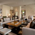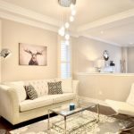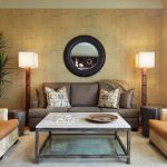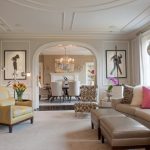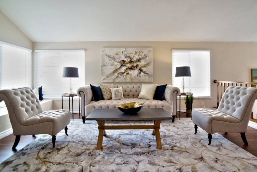 The combination of beige and golden colors is typical for living rooms made in the following styles: