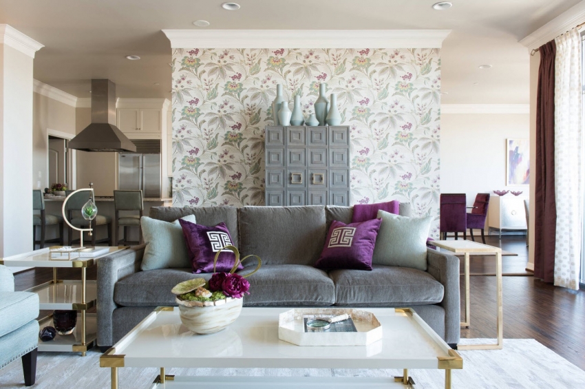 An example of a beautiful combination of wallpaper with floral motifs in the decoration of the living room