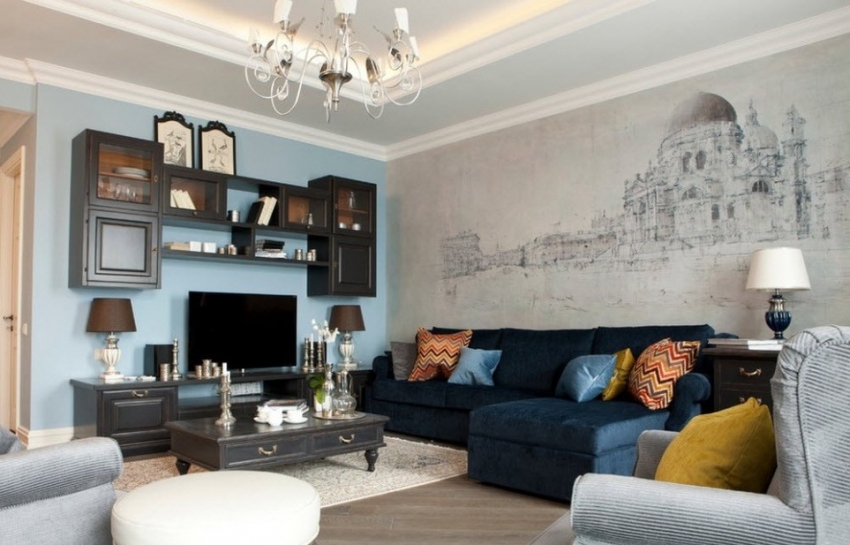 The classic style is considered the most natural and neutral option for interior decoration in the living room. There are no bright and aggressive elements in this direction. The emphasis is on tranquility, harmony and comfort. Italian wallpaper in pastel colors looks perfect on the photo in the living room interior.