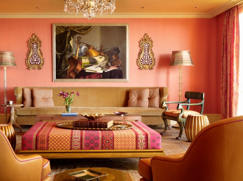 The oriental style in the design of the living room involves the use of wallpaper in warm colors with gold or red ornaments