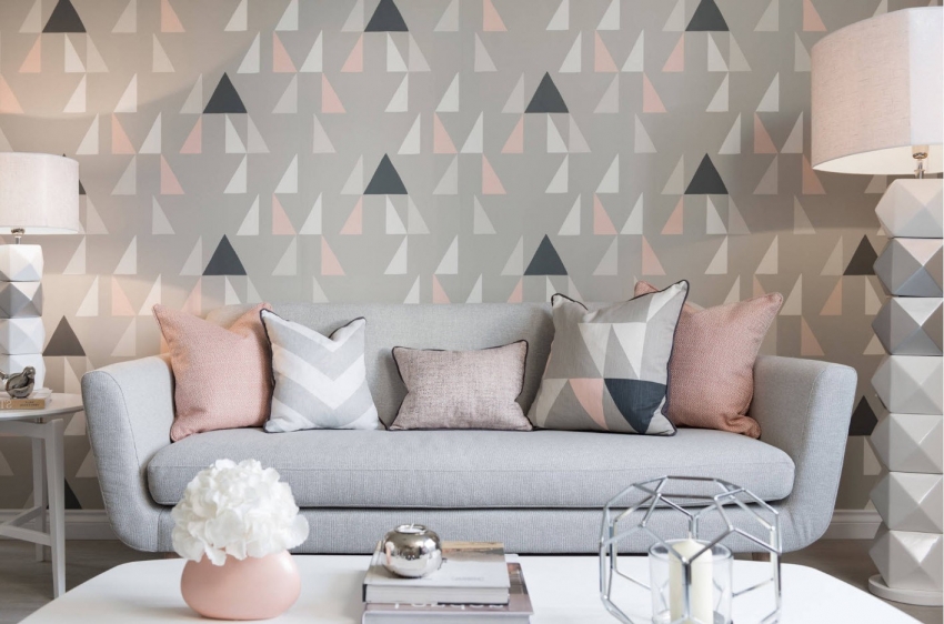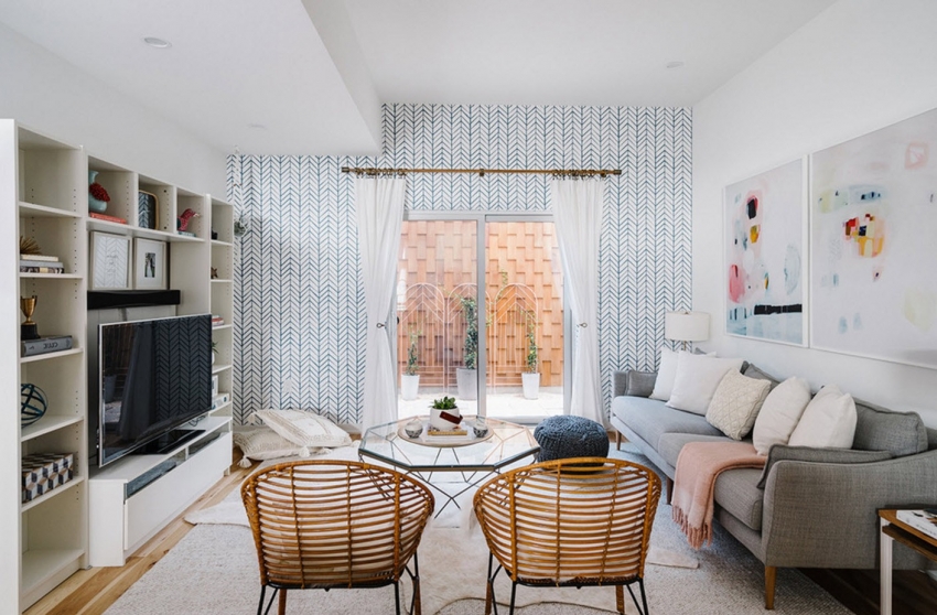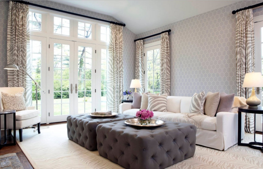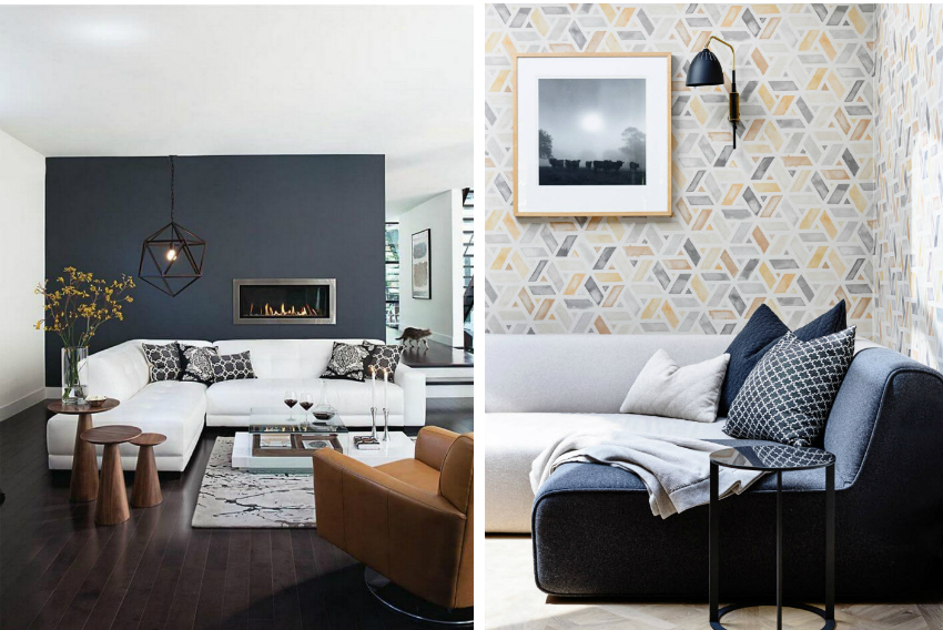 When decorating a living room in one color scheme, it is worth diversifying the interior with wallpaper with a graphic, interesting pattern