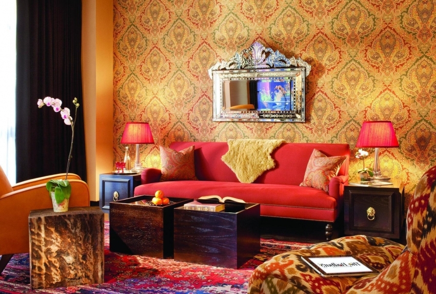 As a decoration for the living room in an oriental style, it is advisable to use wallpaper decorated with ethnic ornaments and patterns. The following colors are welcome in the design of canvases: