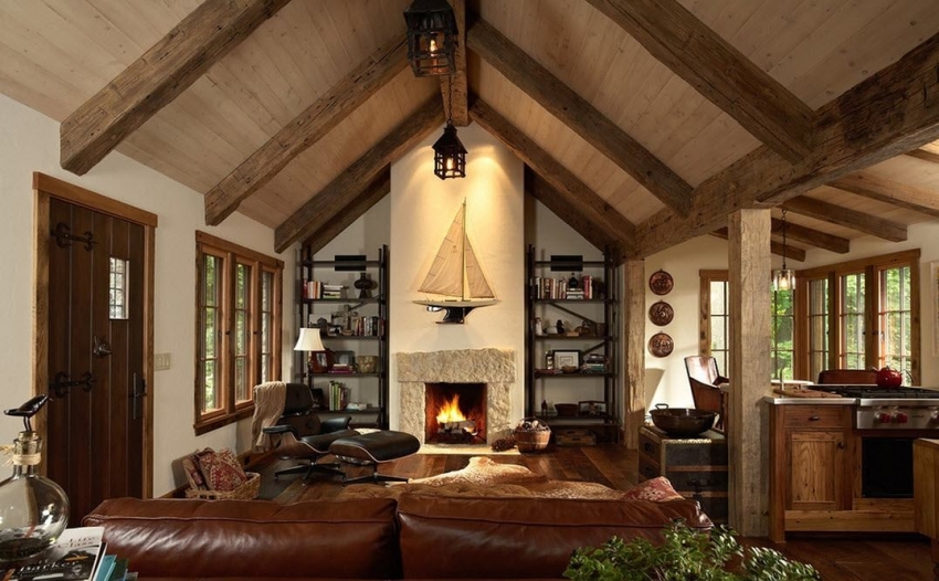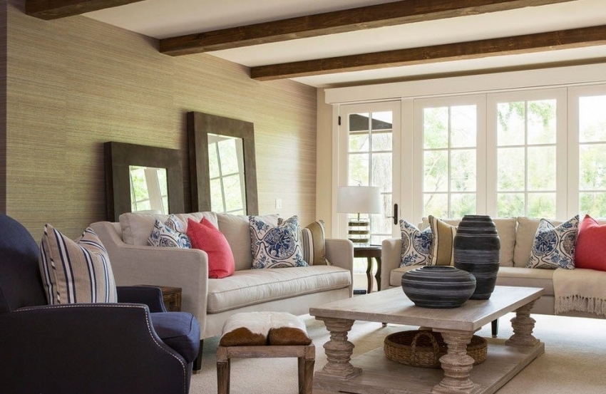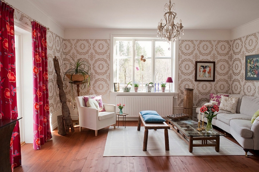 Useful advice! It is advisable that the wallpaper is combined with beams or wood paneling, textiles and curtains. Curtains can be colorful, but the overall range of patterns on them should be muted. For a country-style living room, it is imperative to purchase curtains made from natural materials: silk, linen, cambric, cotton or chintz.