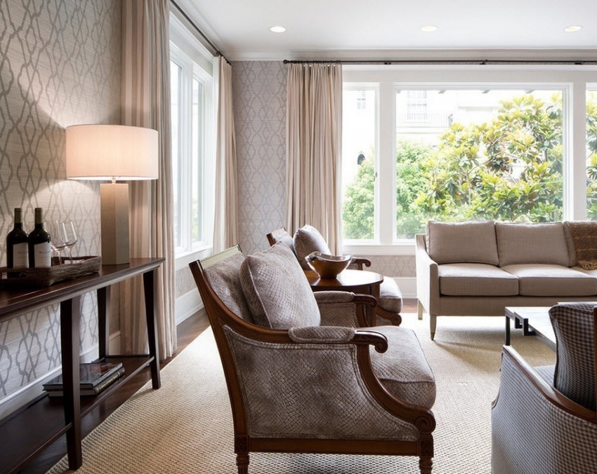 Wallpaper in neutral shades emphasizes the color scheme of furniture and decor elements in the living room interior