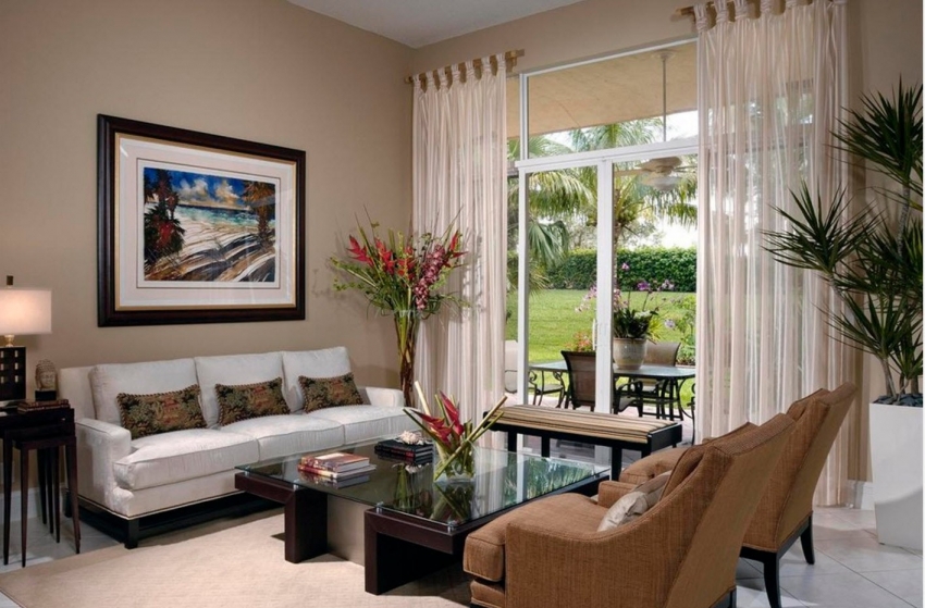 Brown flowers or patterns on a beige background look very impressive in the interior. To create a calm environment, a gray-beige finish is suitable, which can be combined with yellow or red, present in the design of textiles or accessories.