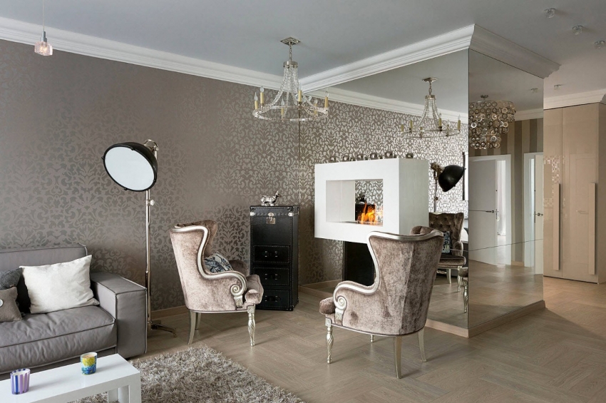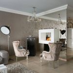 To eliminate the effect of a closed and cramped room, you can use coatings with a shiny surface. In the catalogs of fashionable wallpaper for walls in 2017, there are materials with a glitter effect, made by silk-screen printing. Such coatings are called satin, their canvases have a gilded or silvery sheen. It is not recommended to decorate with wallpaper with a silk effect around the entire perimeter if the room is small. It will be enough to stick the canvases on the central wall.
