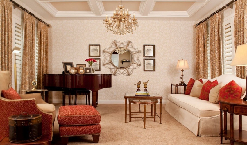 Warm wallpaper in the living room interior: photo of beige, yellow, red and brown finishes