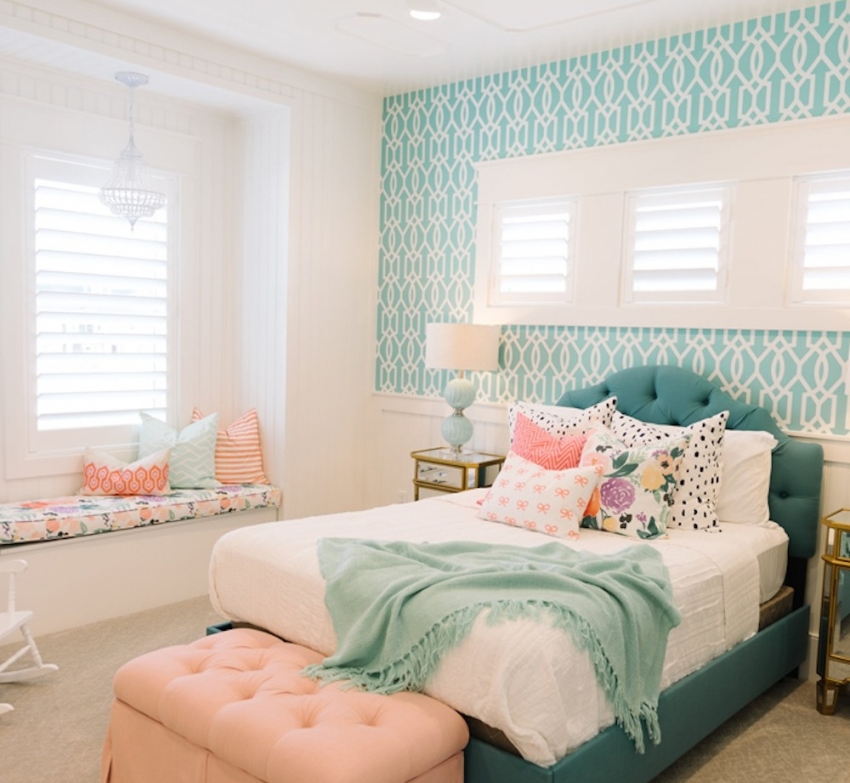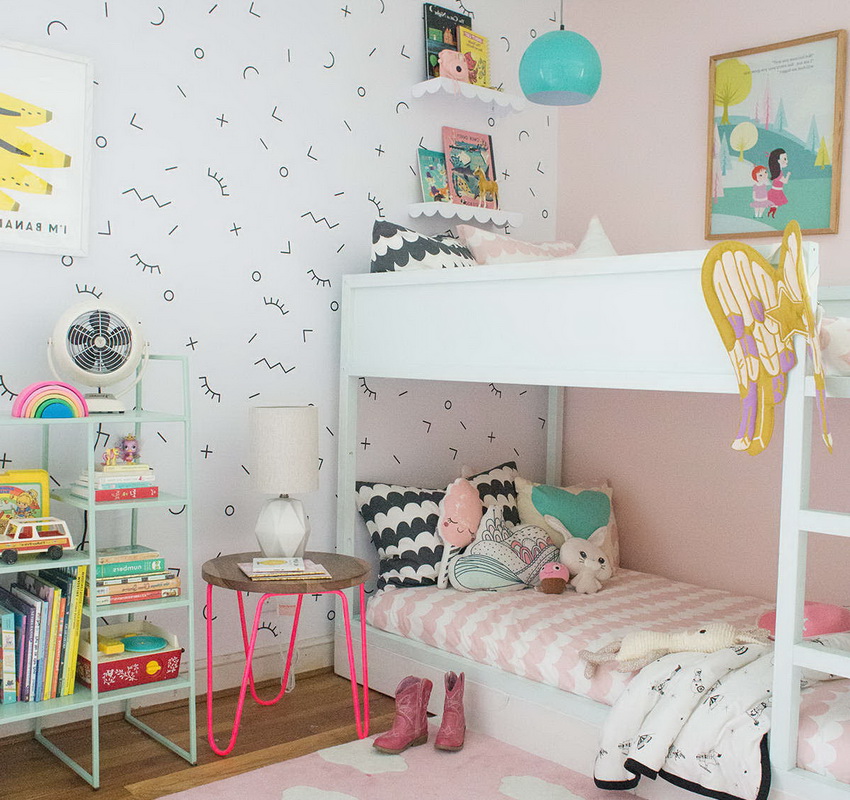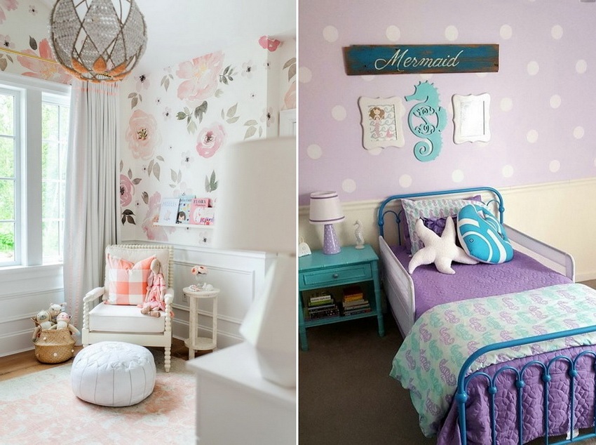 As a decoration, it is better for a children's room for girls to buy wallpaper in light shades, pink, peach, beige and lilac, as well as other pastel colors. The use of orange, muted green and turquoise is allowed. In this case, a floral theme, images of animals, sweets, letters of the alphabet, etc. will be suitable. A stylistic solution in the form of a room of a forest fairy or princess will be optimal.