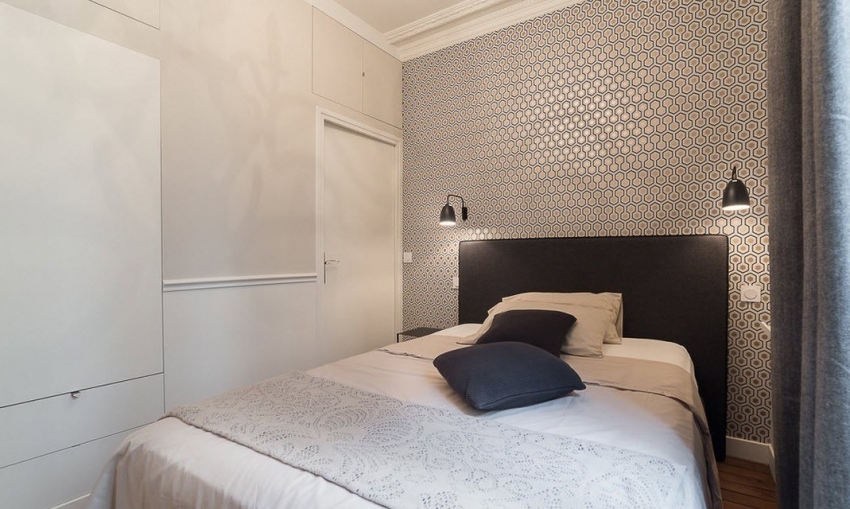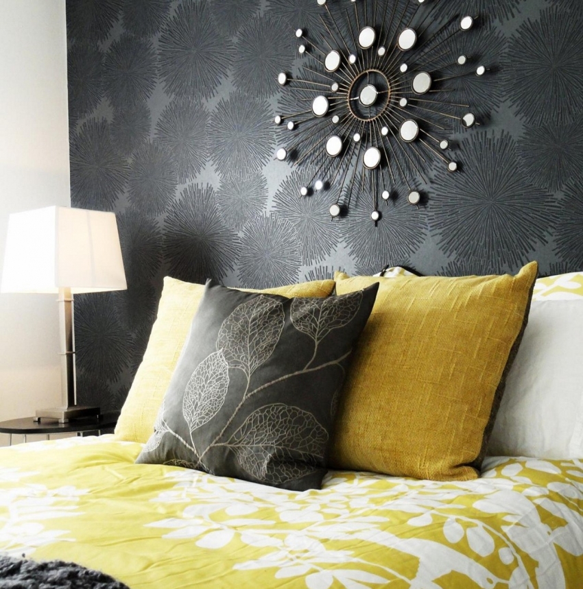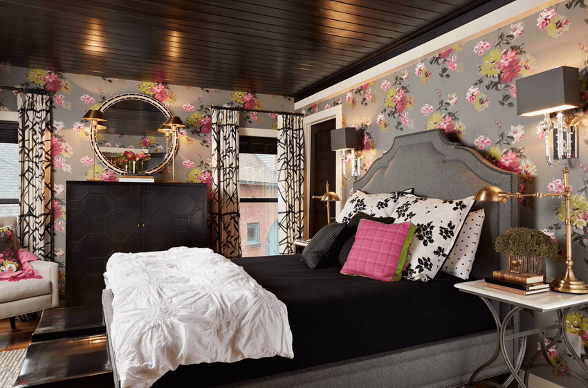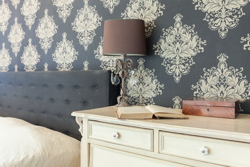 Dark gray finishes should generally be avoided. Overly dark shades will be annoying during rest. If their presence in the room is partial, these areas should not be in the visible field of view. For this reason, it is advisable to stick dark gray wallpaper only by the bed (wall behind the back). In this case, modern wallpaper options will have a monochromatic design. To create an antique design, it is allowed to use finishes of a lighter and brighter shade, decorated with small patterns.