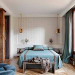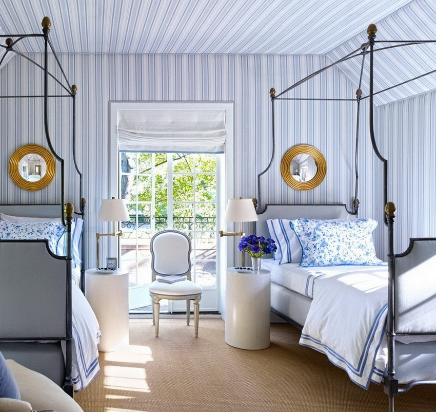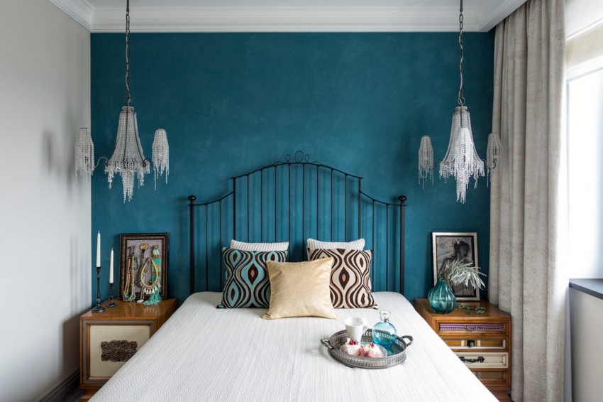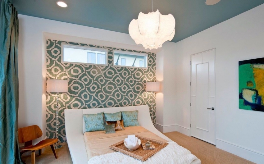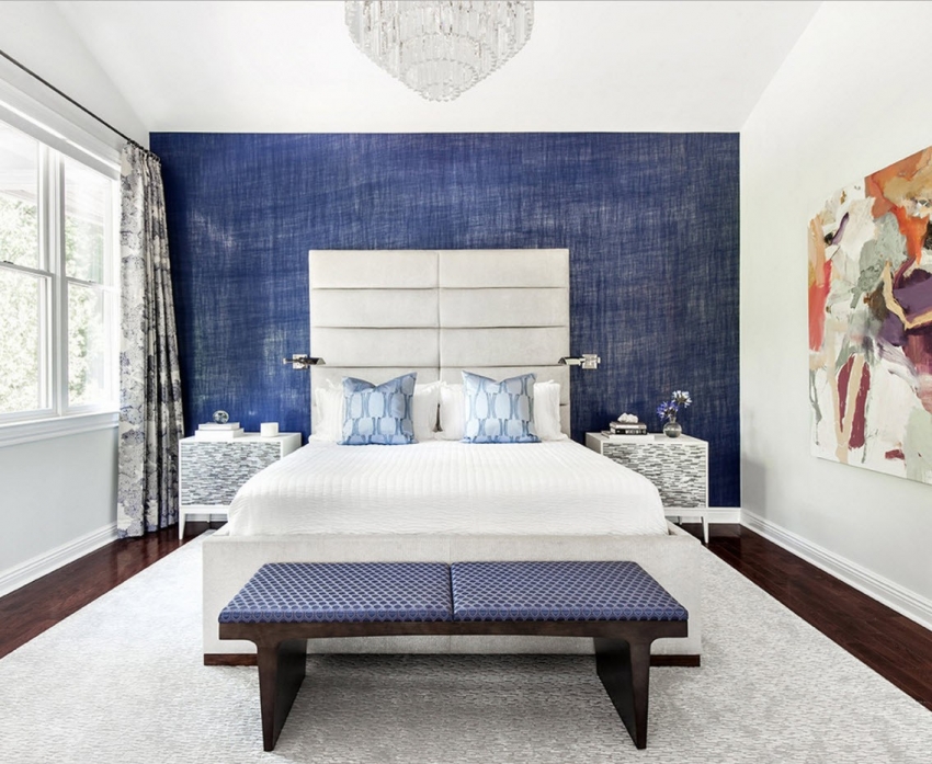 The blue finish looks good in the interior of the bedroom, which has a calming effect on a person. It can be combined with beige, purple, dark brown, white and gray shades. The use of photo wallpaper is allowed.
