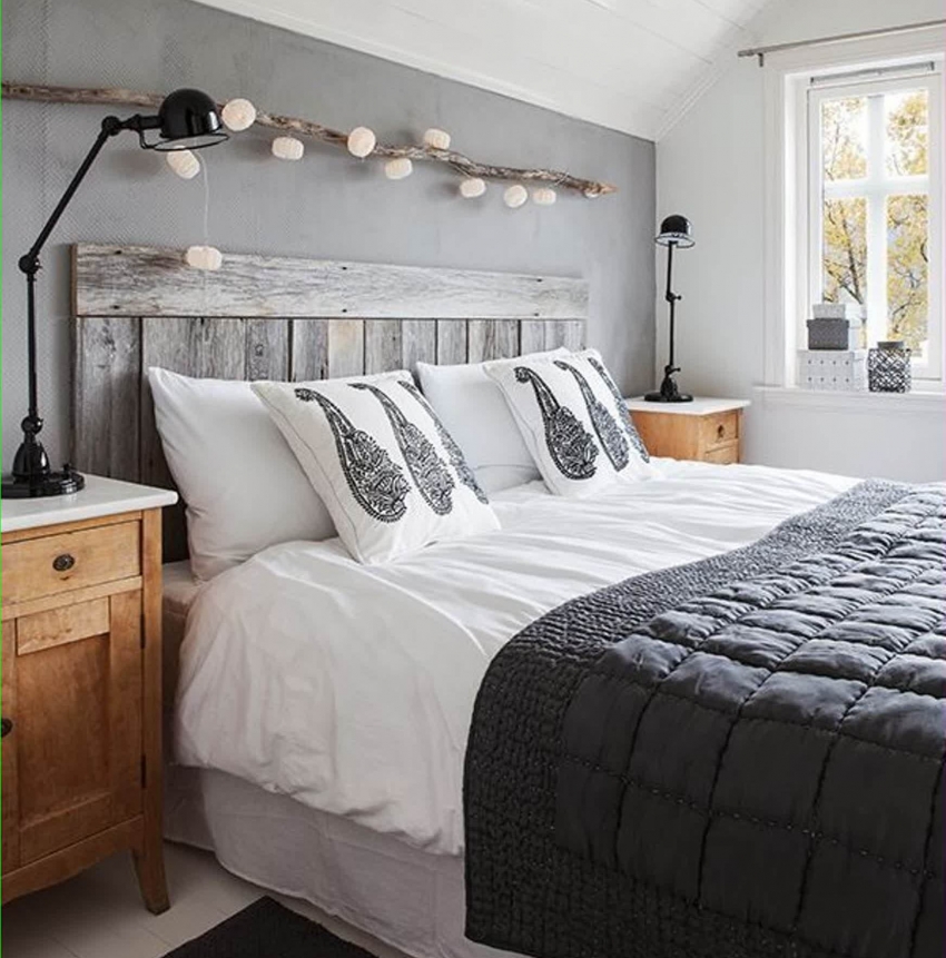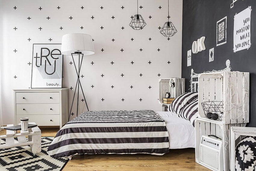 Decorating a bedroom in monochrome requires a combination of wall finishes in order for the interior to be harmonious