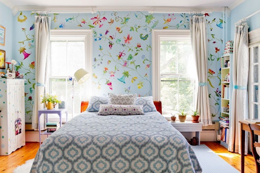 Pastel shades of wallpaper with floral or geometric patterns are suitable for country and Provence interiors