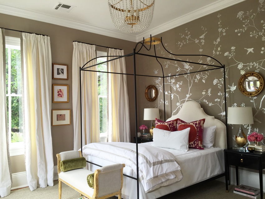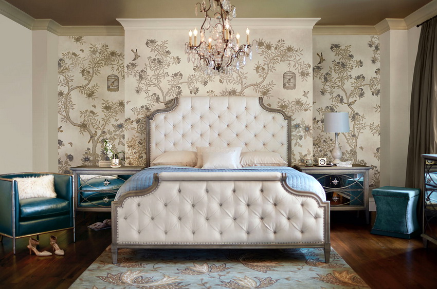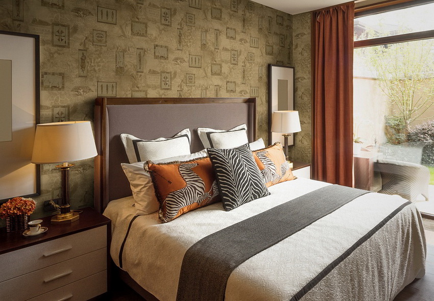 The best option would be the matte color of wallpaper for the bedroom with drawings made in aged gold, almost devoid of shine. It is inappropriate to use shiny prints for a restroom, as glare will interfere with the relaxation of the eyes.