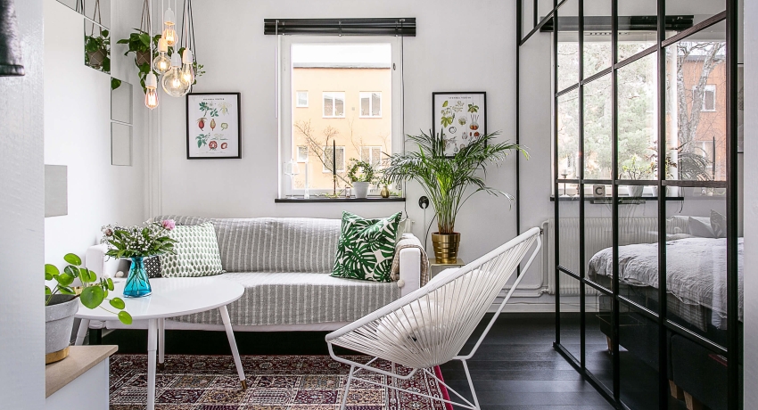 By installing in the room bar counter, an aquarium, a tall vase of flowers, or a large houseplant, you can creatively divide the space.