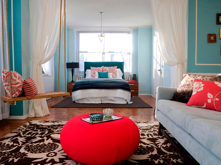 The essence of this approach is very simple: the living room and bedroom are decorated in different colors. But this lesson is quite difficult, since it is required to simultaneously achieve both the separation of zones and the harmony of the shades of the entire room.