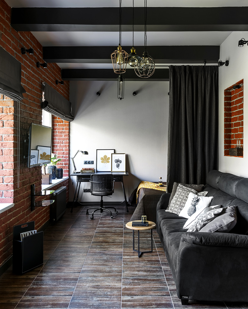Since the room is divided into zones, it is better not to use too dark colors. Such shades will create the effect of visually reducing the space.