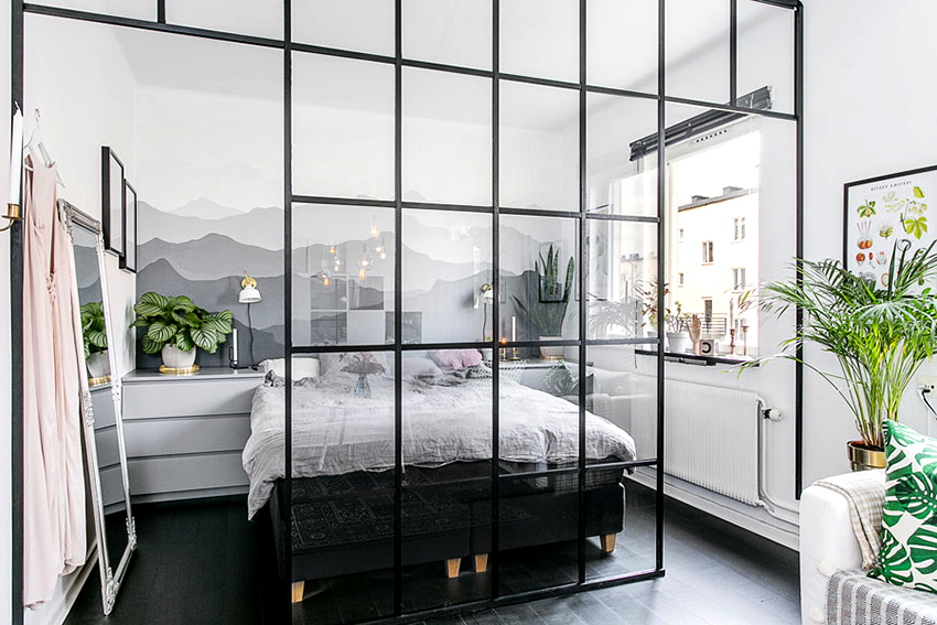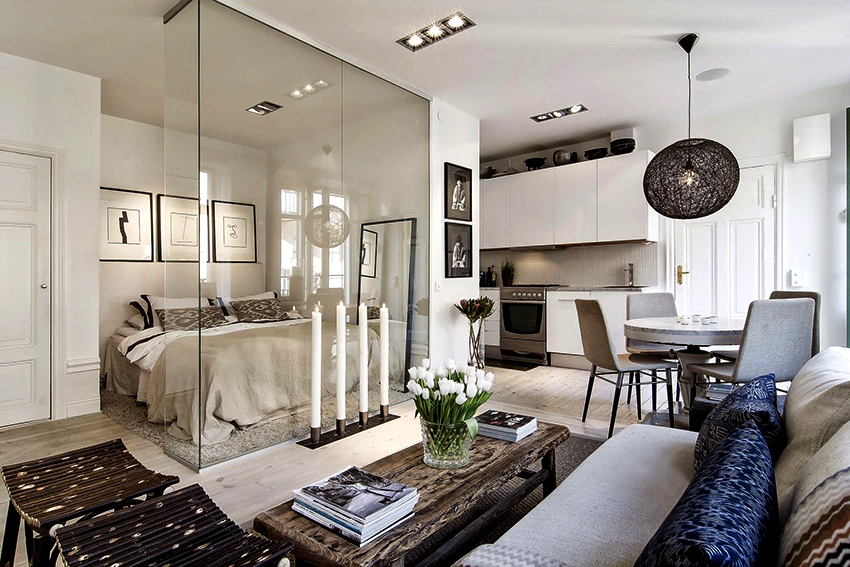 The craftsmen recommend complementing the design with mirror and glass inserts. This solution will bring lightness to the interior of the bedroom-living room, and also will not prevent sunlight from entering the interior of the room. Plasterboard product can be pasted over with wallpaper or decorated with a brick. This will give the bedroom and living room a special charm.